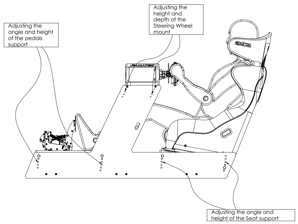 Both the seat and the pedal tray use the same interchangeable mounting plate system. They are secured using a locking pin (goupille) and tightened with an M10 clamping handle for quick and tool-less adjustments.